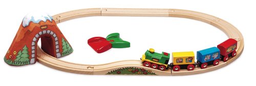 This easy-to-use design makes it a great first set for any young railway buff, with smart details that make every piece compatible with any Brio wooden railway system. This starter collection features solid wood components and a motorized engine that pulls 3 cars around the tracks and down the ramps. Set includes a fabric, padded mountain with a tunnel and one small hill-shaped track section, plus 15 other pieces. One-button engine on/off; requires one AA and one 1.5-volt battery (not included). For ages 18 mos. and up. Wood, fabric and metal. Imported. Total track length: 69-1/2".